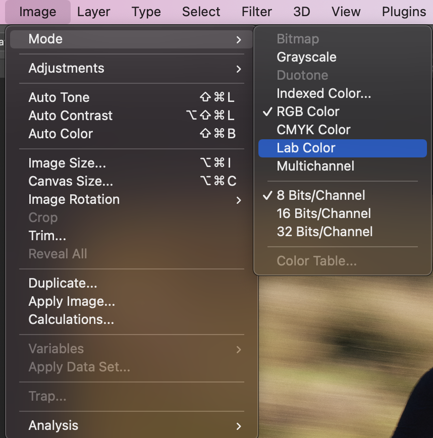 - Image > Mode > Lab Color