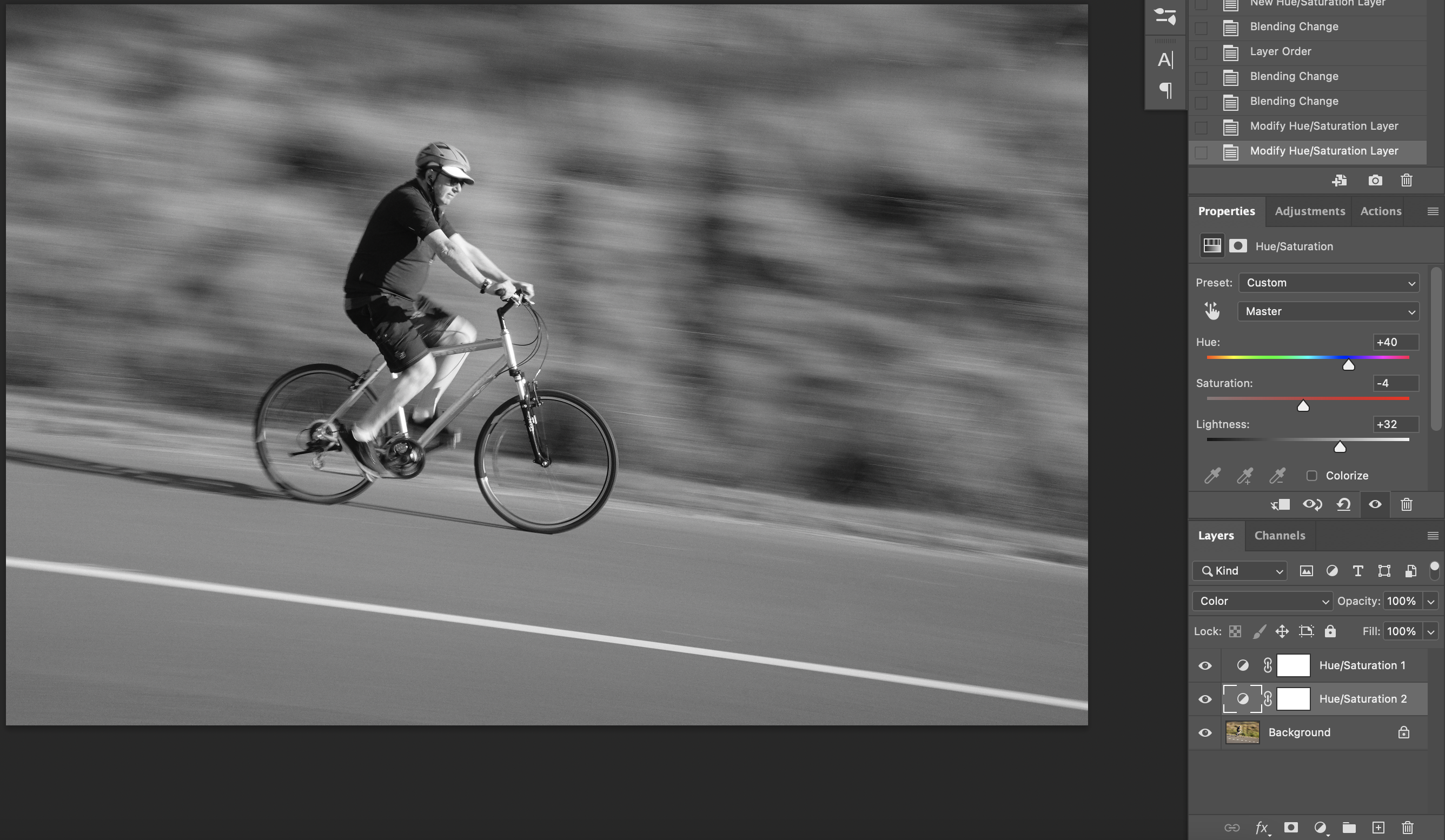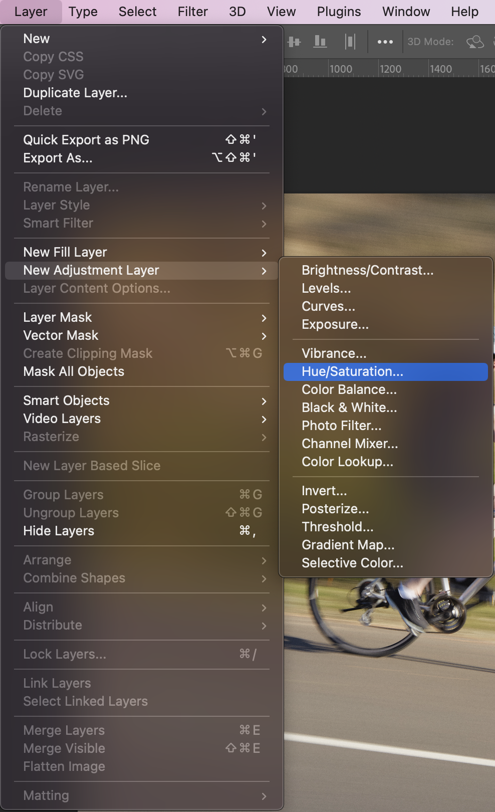 - Layer > New Adjustment Layer > Hue/Saturation