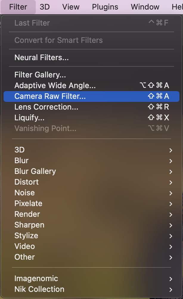 - Filter 메뉴를 다시 클릭하고 Camera Raw Filter. 필터를 선택합니다. 이 작업은 Camera Raw 인터페이스를 불러옵니다.