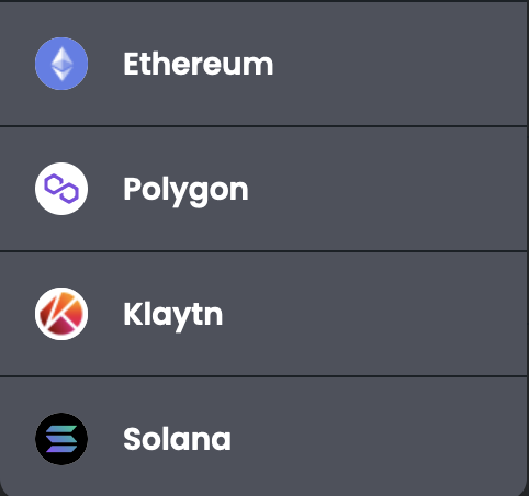 현재는 이더리움, 폴리곤, 솔라나, 클레이튼 코인으로만 거래가 가능합니다.
